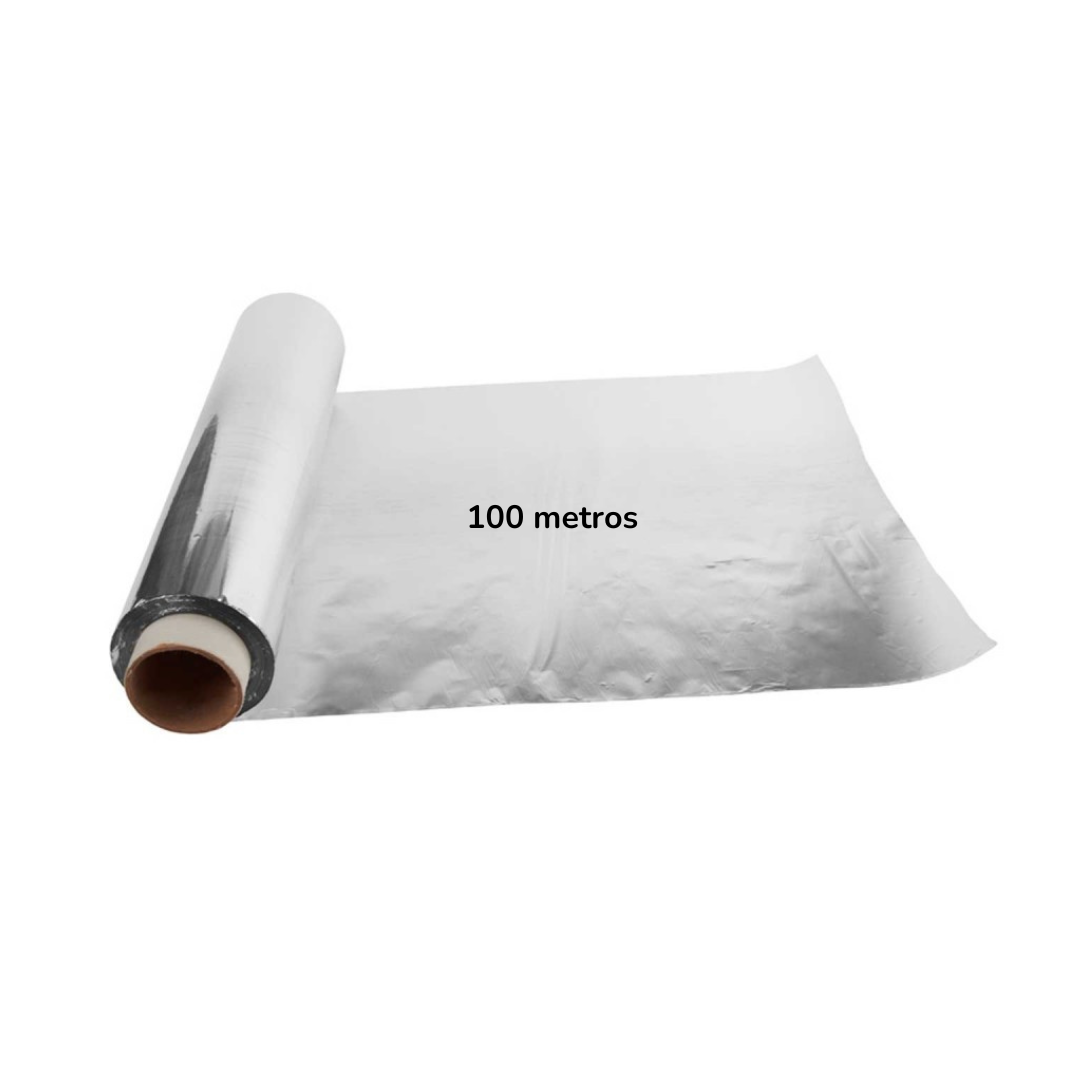 Rollo de aluminio de 12 cm de anchura, 14 micras de grosor y una longitud total de 100 metros.