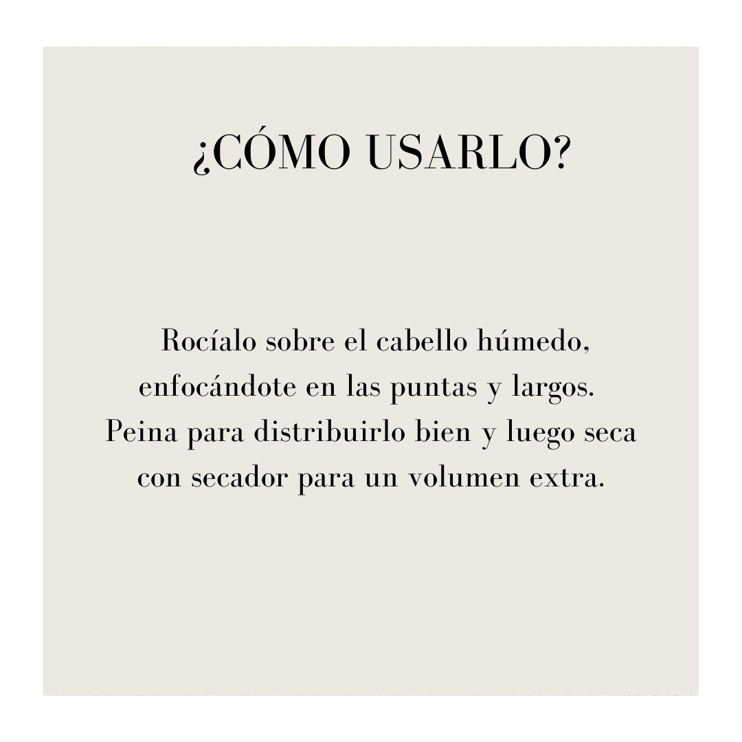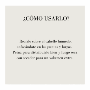 ¿Cómo usarlo? Rocíalo sobre el cabello húmedo, enfocándote en las puntas y largos. Peina para distribuirlo bien y luego seca con secador para un volumen extra.